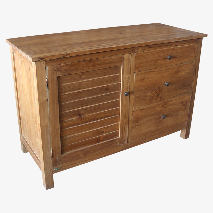Buffet en teck massif, comportant un côté tiroirs, l'autre avec des rayonnages (porte à gauche). Modèle idéal pour la salle de bain. Nombreuses variantes de coloris et finitions, possibilité de commande sur-mesure.